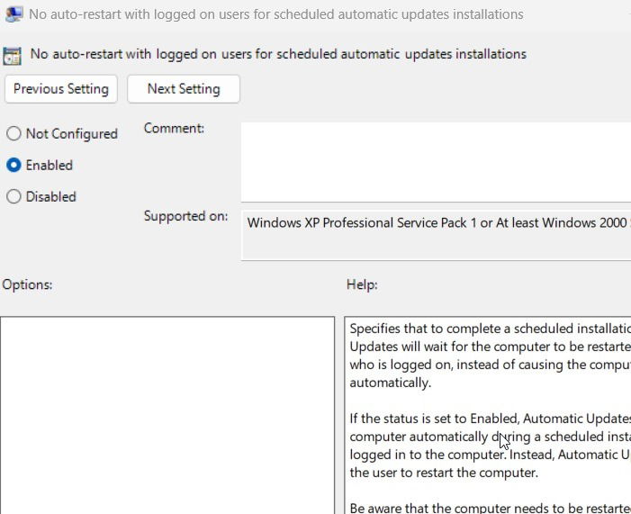 Sélectionnez le Activé boîte et cliquez Appliquer -> D'ACCORD Pour désactiver complètement la fonction automatique-re-start pour toutes les futures mises à jour. Cette méthode permet toujours les téléchargements de la mise à jour de Windows, mais il n'y a pas de redémarrage forcé.