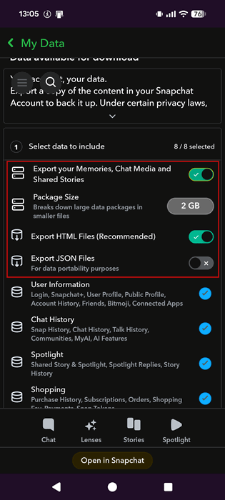 Si vous ne voulez pas perdre de temps à exporter vos souvenirs par lots, une autre option consiste à demander vos données Snapchat. De cette façon, vous pouvez facilement récupérer l’intégralité de vos archives Memories, pas seulement celles que vous souhaitez conserver.