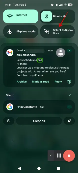 Appuyez dessus pour l’activer. L’écran clignotera une fois et affichera une bordure verte. Ensuite, ouvrez le volet de notification et appuyez sur l’alerte que vous souhaitez entendre. Lors de la lecture, chaque mot est mis en évidence dans un encadré vert.